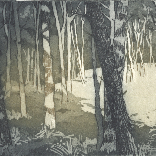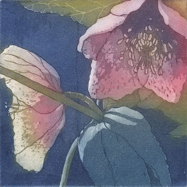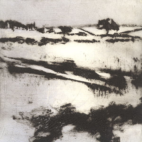 She is particularly known for her etchings and colour aquatints and more recently has turned to monotypes and carborundum prints for larger, less detailed work. Her inspiration comes from the natural world, looking for patterns in subject matter defined by light, shadows and season, often cropping an image to produce negative shapes.